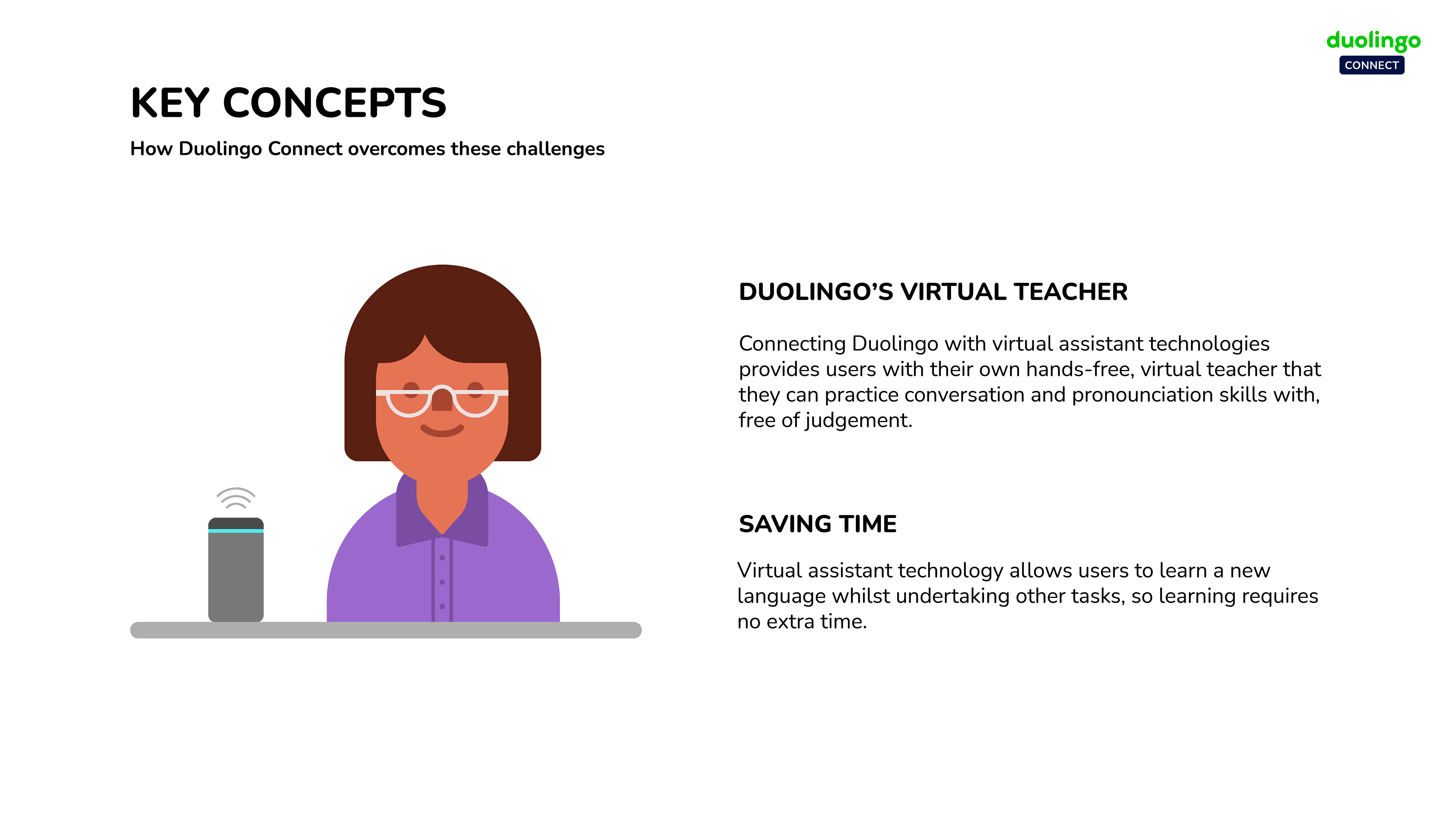 Duolingo Connect uses virtual assistant technology and celebrity podcasts to enhance the experience of language learning. Linking to virtual assistants provides users with a hands-free virtual teacher that enables language learning whilst undertaking other activities, so learning requires no extra time. It allows individuals to practice their communication and pronunciation skills in a safe, non-judgemental environment. Celebrity podcasts support daily language lessons, whilst immersing the listener in a variety of cultures around the world.