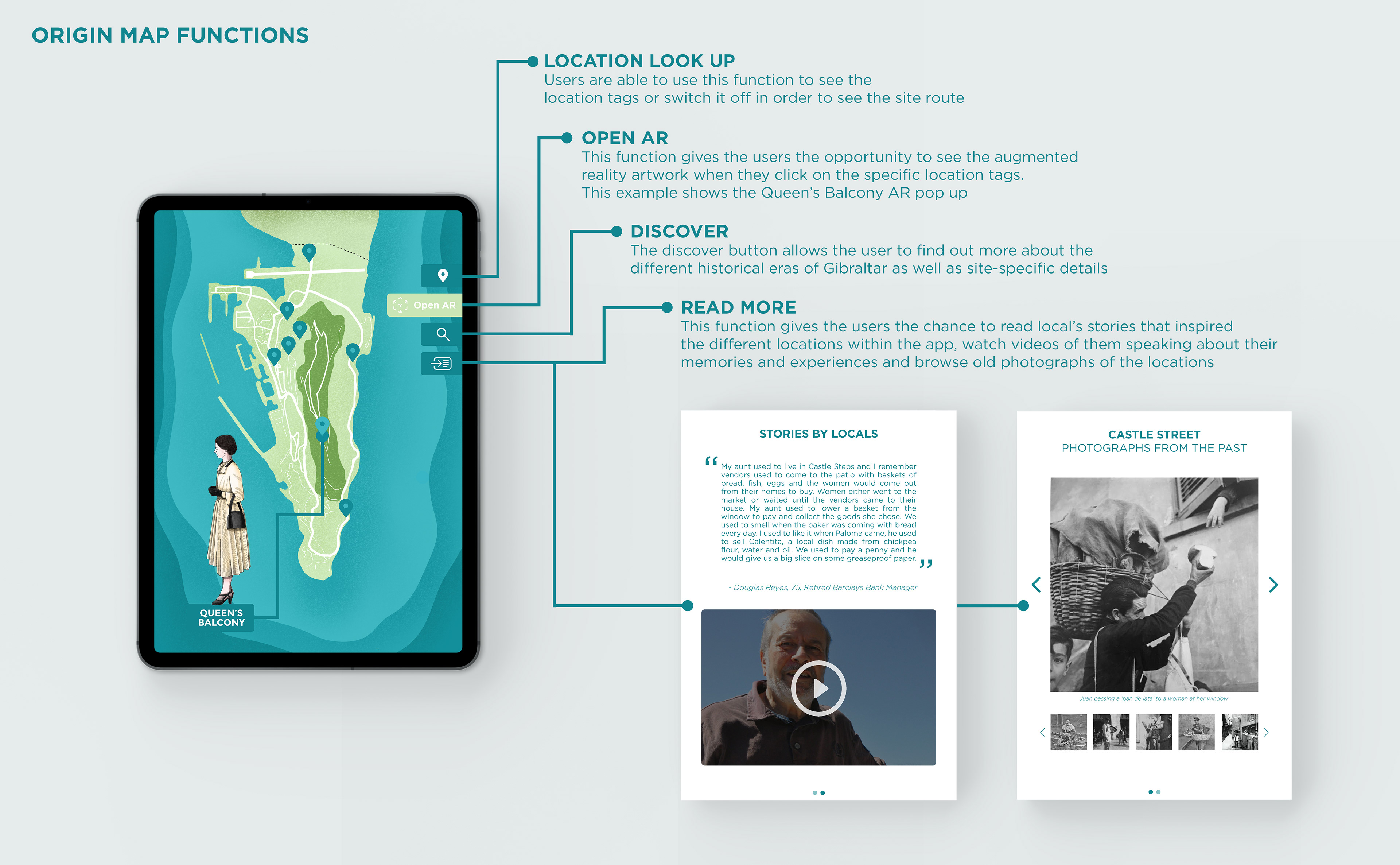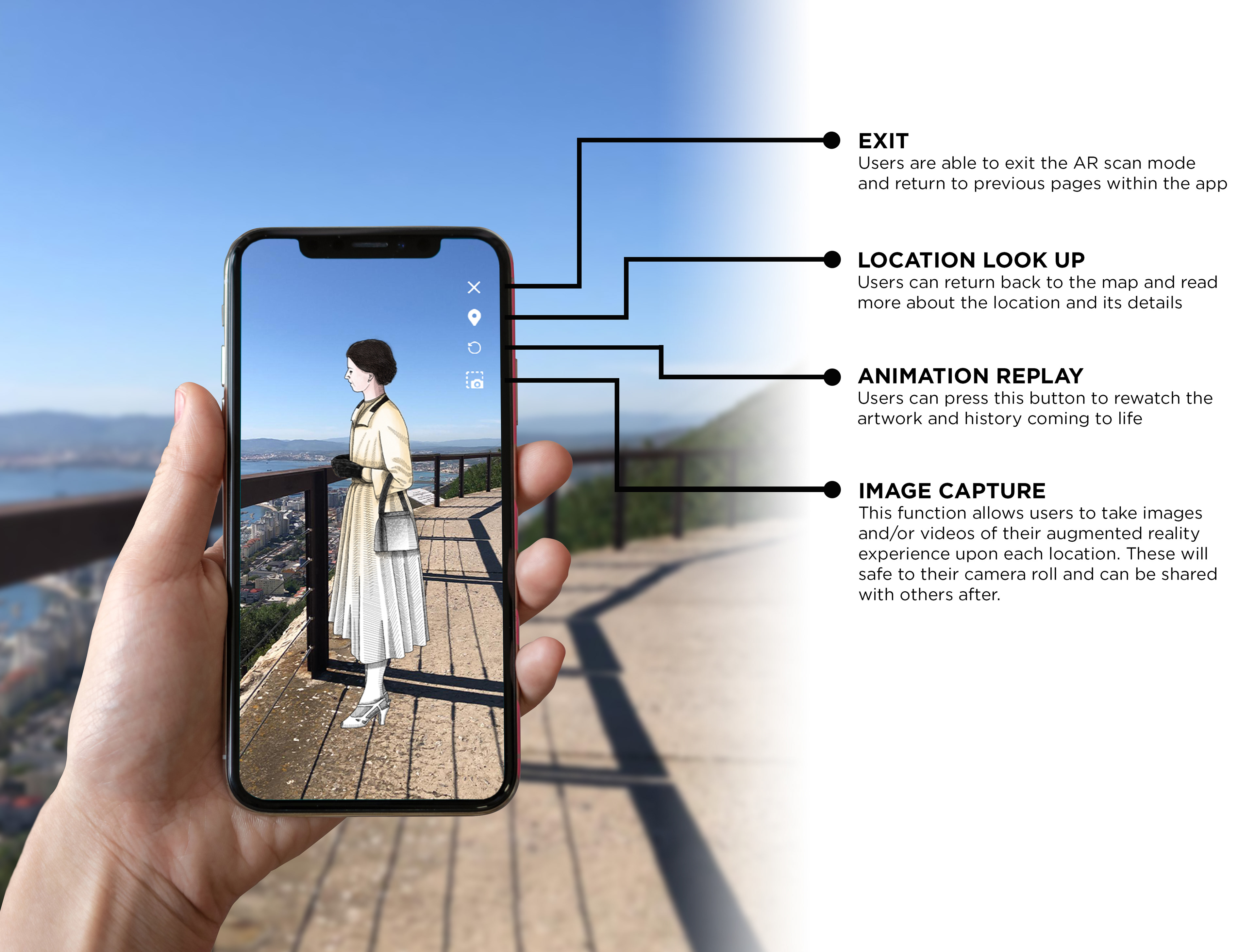 The project is primarily aimed at adult tourists visiting Gibraltar, but could also be extended to local, young adults interested in keeping the history alive. The locations available are linked to relatively unknown places, events and real-life stories that visitors are unaware of, providing them with visual historic representations of what