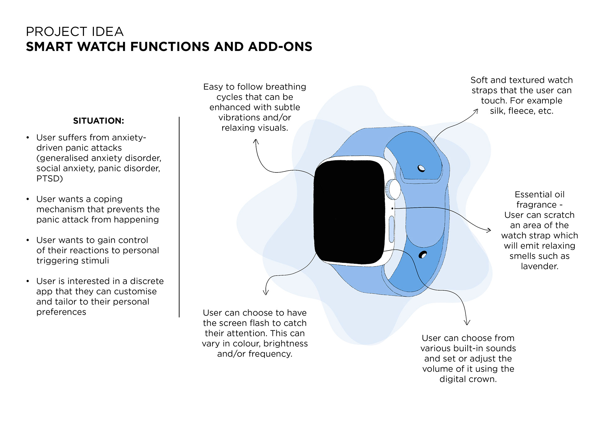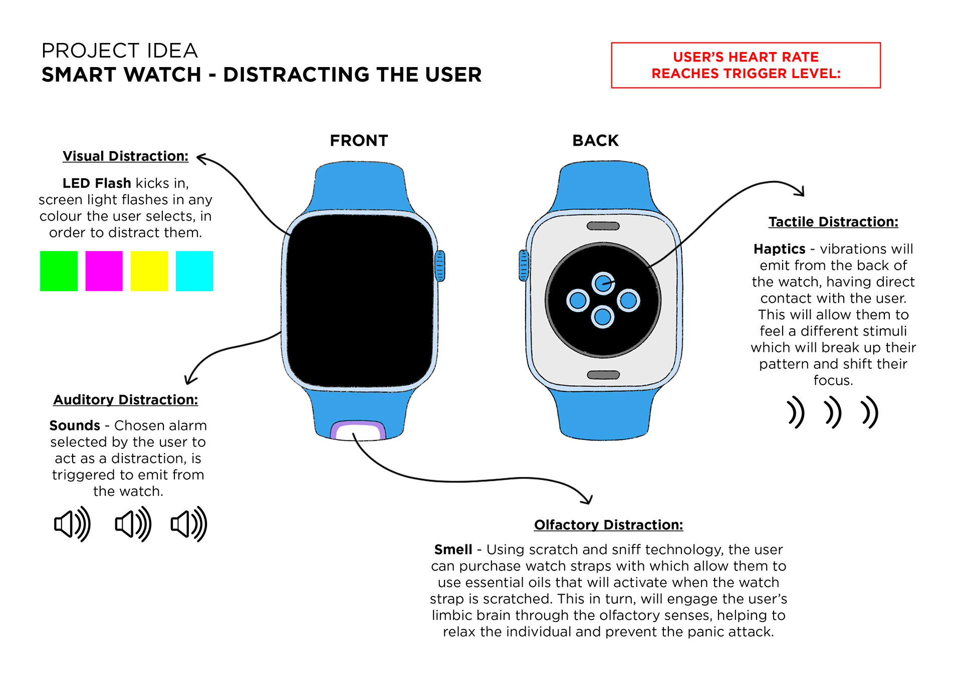 Shift puts the power in the hands of the individual, with a discreet application that can be used anywhere, at any time. Users can also purchase ‘scratch and sniff’ watch bands available in various colours and textures. They are able to apply their choice of essential oil to their band in an attempt to stimulate tactile and olfactory senses as another form of distraction to help calm the user.